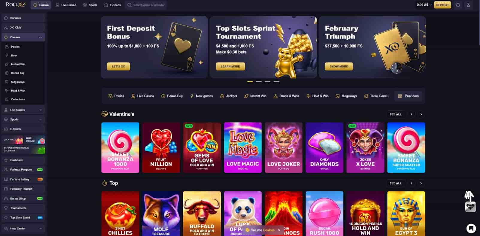 RollXO is a pokies led casino site aimed at Australian players who prefer an AUD balance, quick deposits, and promo codes activated in the cashier. The lobby is organised by slot filters such as New, Megaways, and Bonus Buy, so it is easier to find a style of spin quickly. Live dealer tables sit alongside the pokies, but slots remain the main focus for most users. Most advertised promos start from an AUD 30 deposit, and the payments page lists minimums for deposits and withdrawals.
